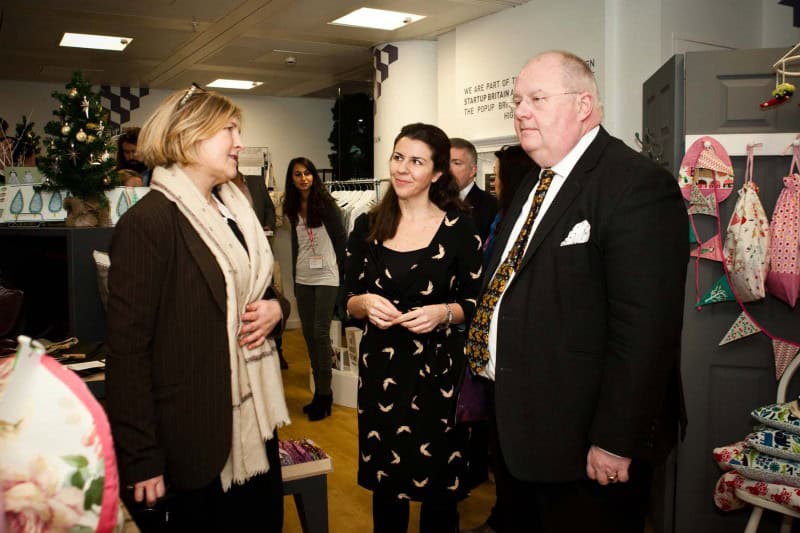 L-R: Deborah Reyner who runs crafted goods company Milla & Arti, with Emma Jones, co-founder of StartUp Britain, and Eric Pickles at a PopUp Britain store in London © Department for Communities and Local Government