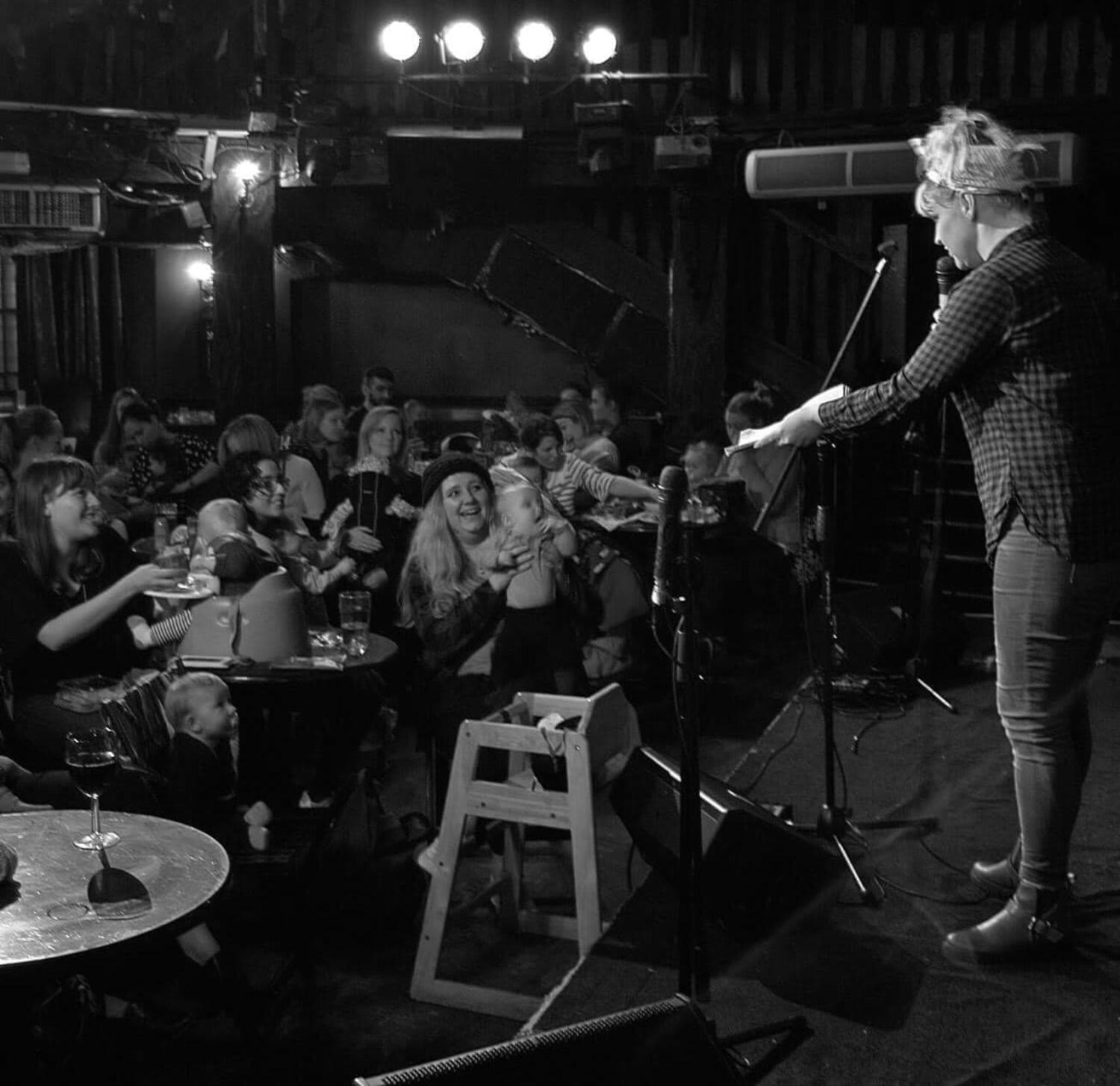 I’m co-hosting Every Other Mother, a baby-friendly event for mums combining stand-up comedy, poetry, short stories and other creative writing. Co-founder Sally McIlhone, who describes the shows as a “lunchtime cabaret”, greets the arrivals in a bright orange sequinned skirt, floral shirt and leopard print boots.