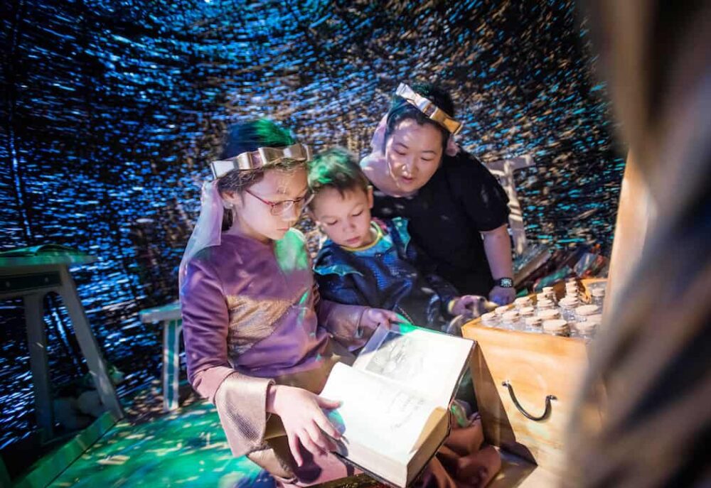 There are multiple zones, including a little town with shop fronts, a palace and a horse-drawn carriage. Huge tactile fabric pebbles sit alongside brimming baskets of pretend food and racks and racks of gleaming dress-up outfits, headwear and jewellery. It’s less ‘Look but don’t touch’ and more ‘Look and touch everything and dive with total imaginative abandon into your own stories and games until your parents literally drag you out at closing time’.