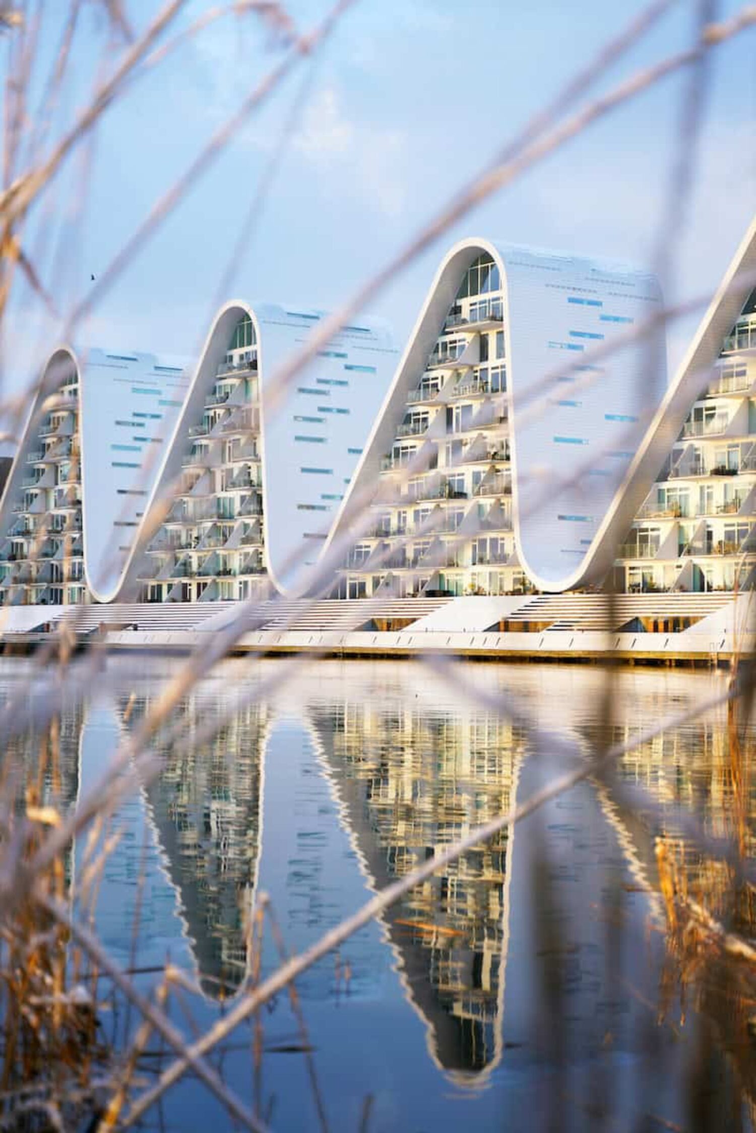 Waves etched in concrete – the Bølgen complex in Vejle rises over the fjord. Image: Morten Elsborg