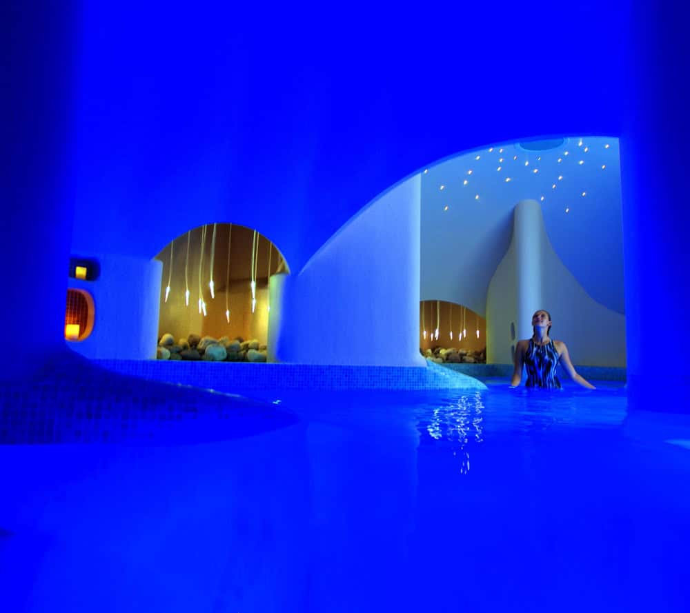 The highlight of the facilities, a thermal spa area, offers a selection of saunas, steam rooms and other zones aiming to provide a full sensory experience. Particularly worth a visit are the 100% humidity volcanic salt bath and the candle pool – a genuinely tranquil water cave of soothing colours, twinkling lights and soft music.