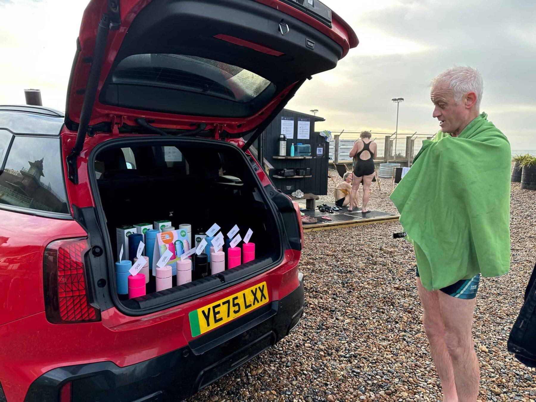 In Brighton, swimmers emerging from the sea were handed hot drinks in refillable bottles rather than disposable ones. The giveaway was organised by frank green, an Australian-founded reusable bottle brand that has made open water swimming central to its UK campaign this year. The event was supported by MINI, whose electric Countryman formed part of the backdrop – a low-emissions model positioned around similar environmental values.